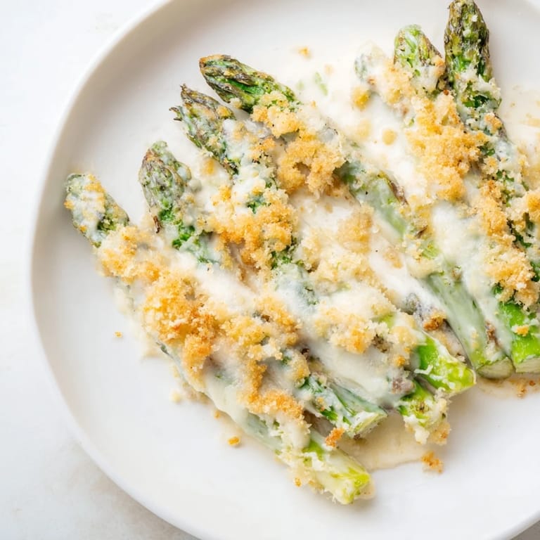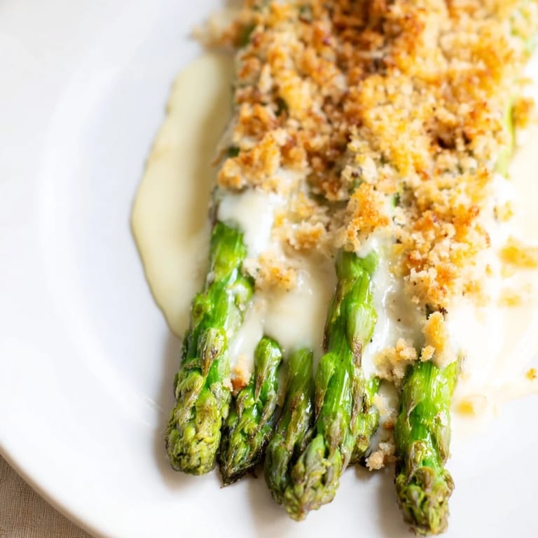 The buttered breadcrumbs create a golden, crunchy crust that adds texture contrast to the creamy asparagus base.