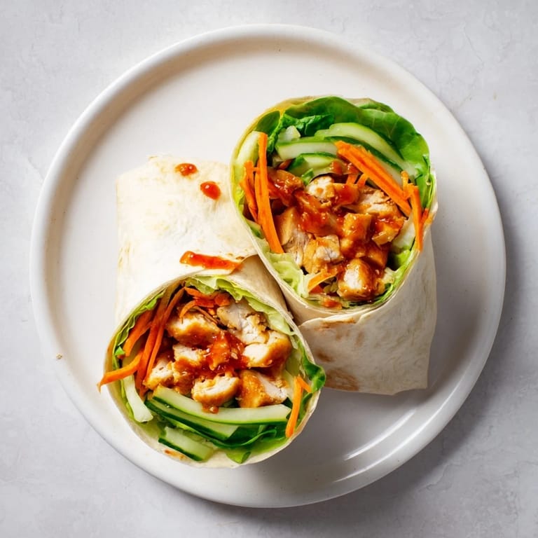 Prepare the components separately in advance—cook and sauce the chicken, chop vegetables, and store in airtight containers. Assemble wraps just before serving to prevent tortillas from becoming soggy.