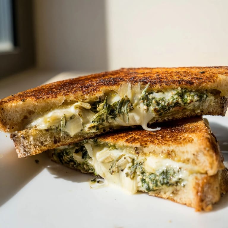 Save The first sandwich I made after moving into my apartment with the tiny galley kitchen was a grilled cheese, but not just any grilled cheese. I had leftover spinach artichoke dip from a party, barely enough to justify keeping, and I thought why not turn it into something new. The smell of garlic and melting cheese filled that cramped space and made it feel like home. I've been making this version ever since, tweaking it until the filling became something I could make fresh every time. It's become my go-to when I want comfort with just a little more effort than the usual.